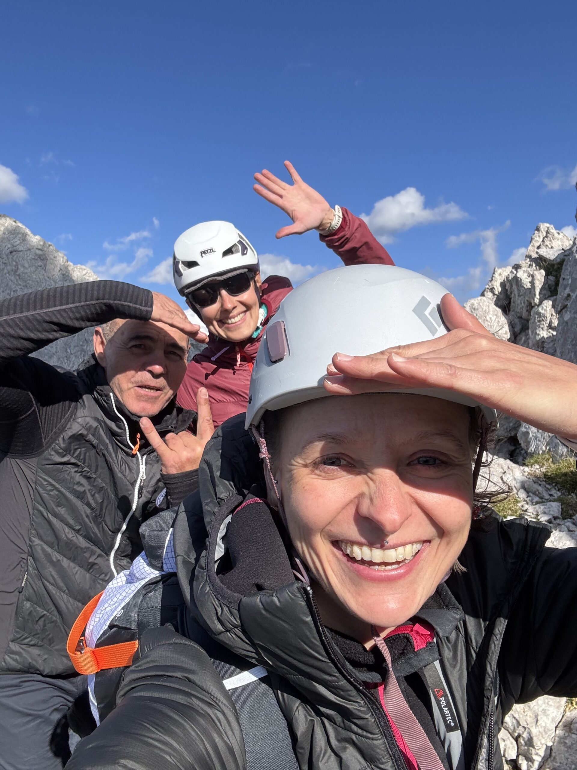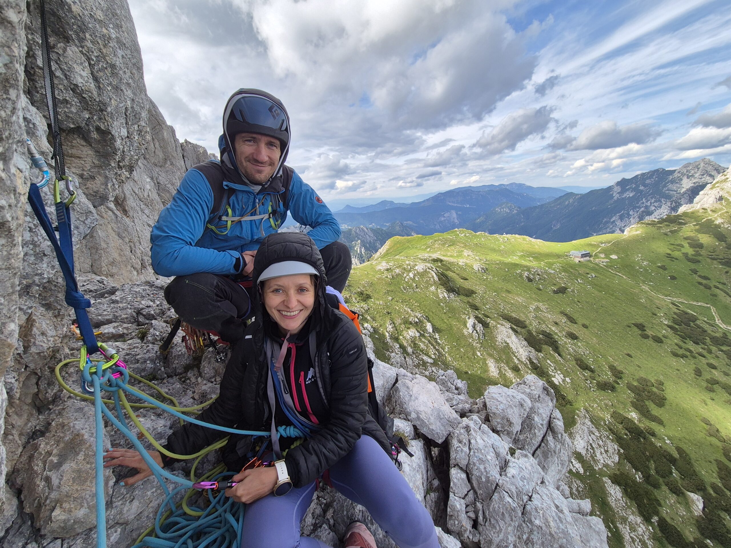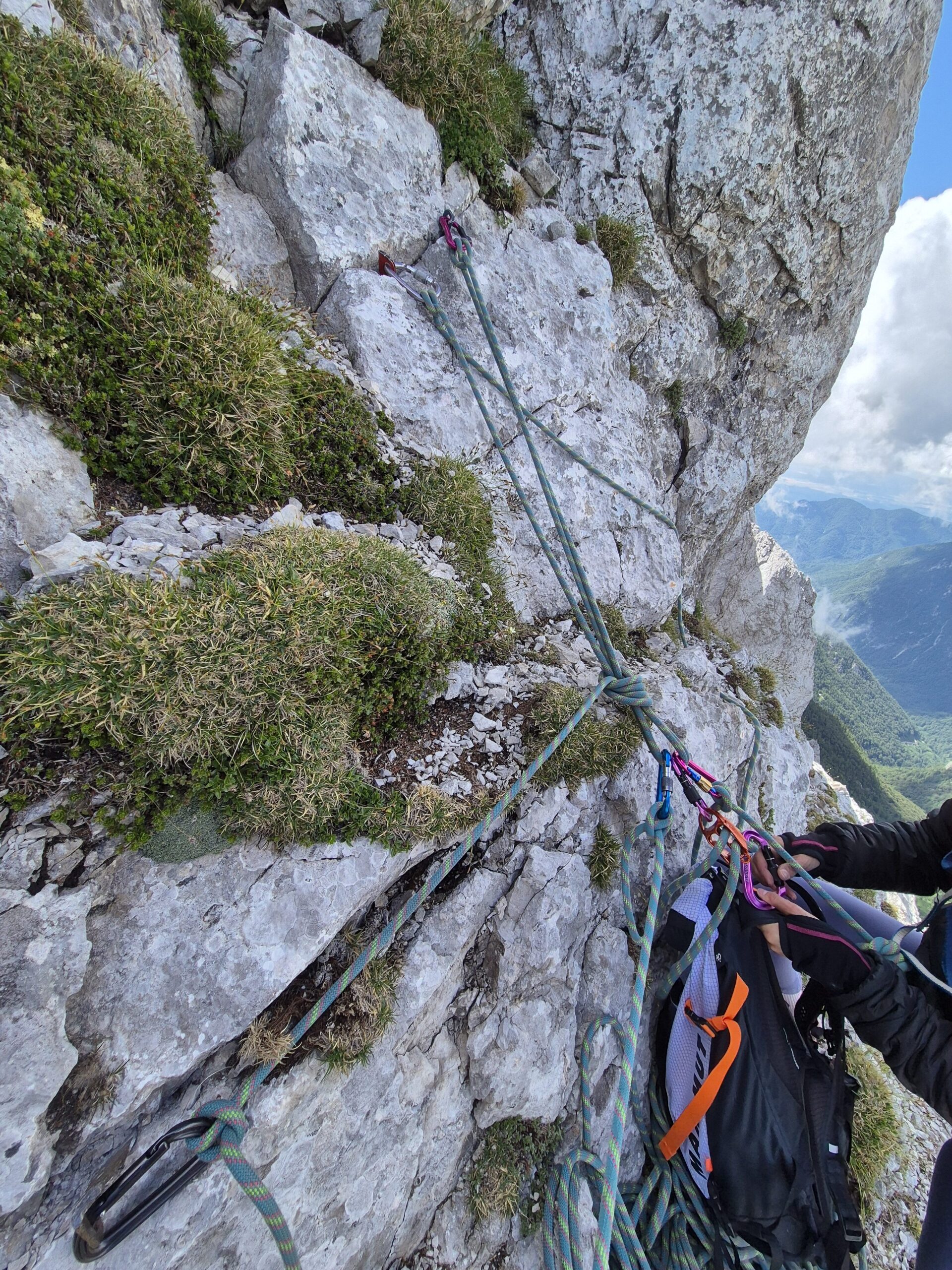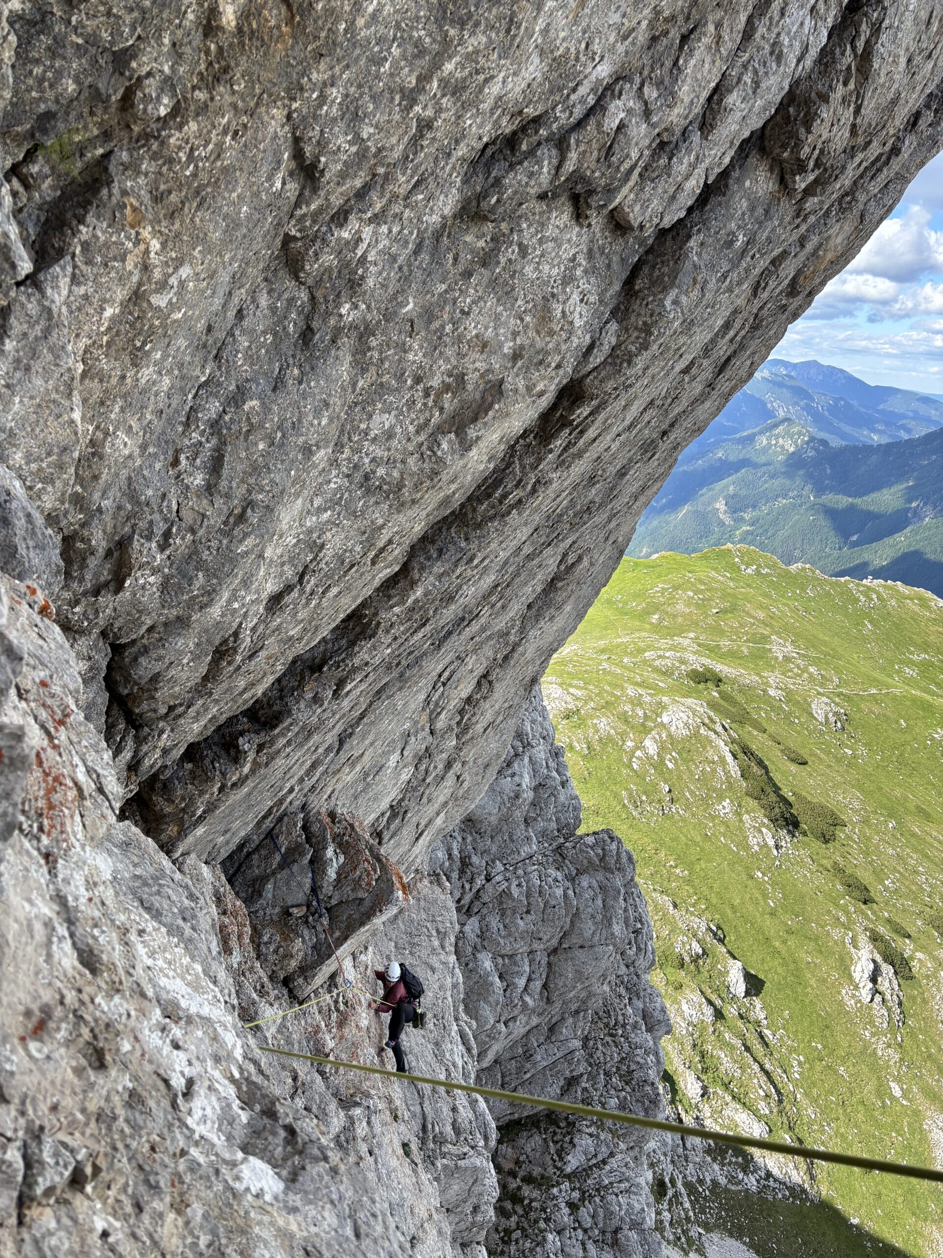 Po zajtrku naju je prevzel Janko Oprešnik – bolj znan kot Zumba. Če ste mislili, da je plezanje zgolj in samo resno početje, se motite – Zumba je dokaz, da gre tudi s smehom na polno! Megla nas je sprva zmedla, a veter jo je hitro odpihnil, in smo začeli z izbijanjem klinov ter nadaljevali z abzajlom. Ko sva z Zumbo preleteli Poševno zajedo, smo dodali še Zajedo v Brani, kjer je srčni utrip dobesedno poskočil. Ob vrnitvi je Toni komentiral, da še nikoli ni videl Zumbe tako nasmejanega – kot po celodnevni turi z nama z Gajo!