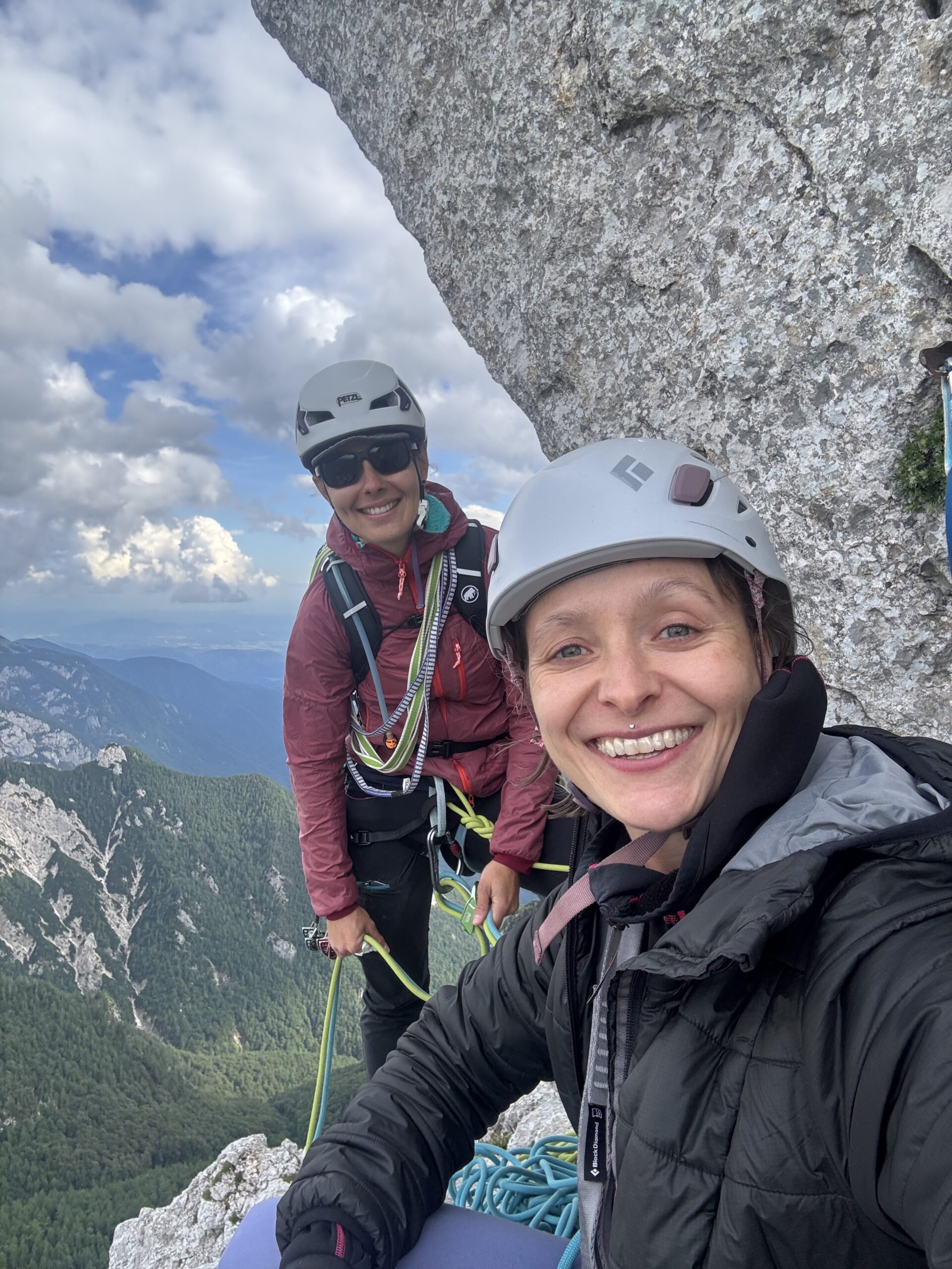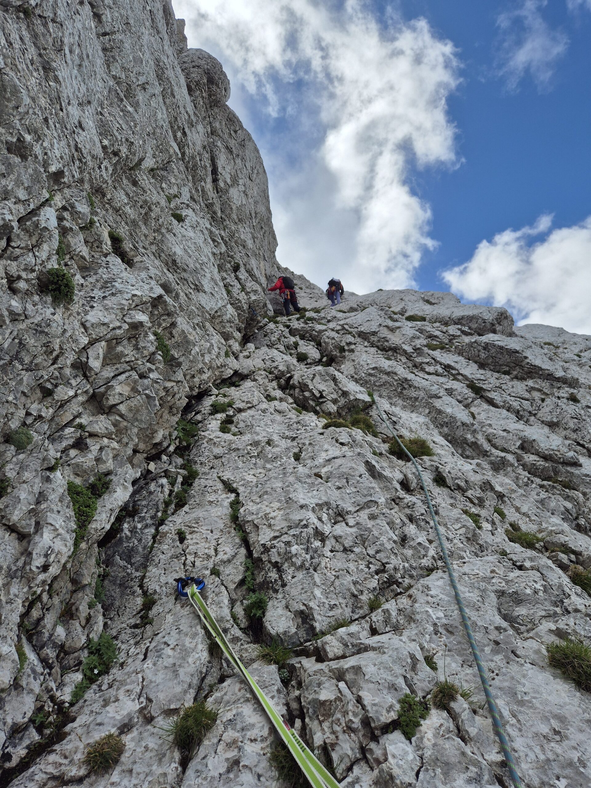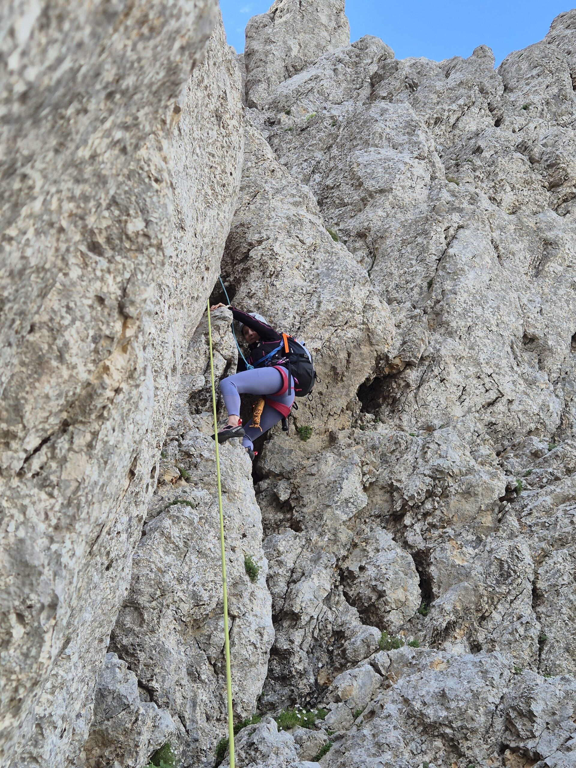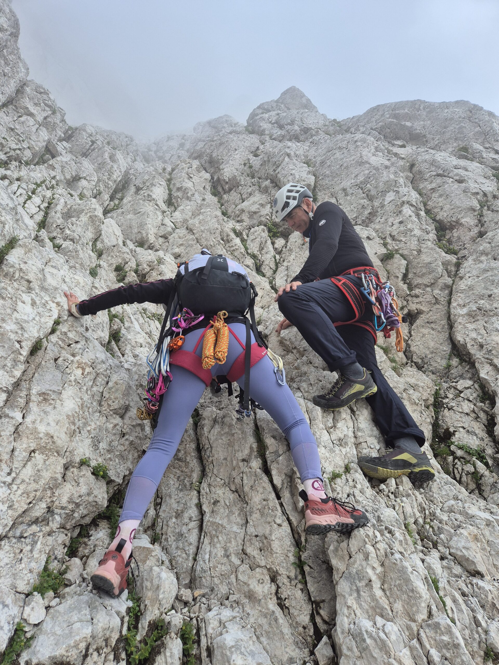 V navezi z Gajo iz ČAO sva bili prava zasedba – smeh, hitri koraki in nov nauk na vsakem koraku. Miha Habjan naju je popeljal v Škarjevo varianto zgornjega stebra. Plezali sva v vodstvu, pri čemer naju je varoval od zgoraj. Miha je bil pravi učitelj in komik v enem – naučili sva se novih sidrišč, pridelali prve žulje ob izbijanju klinov, pa še za dobre fore je bilo poskrbljeno.