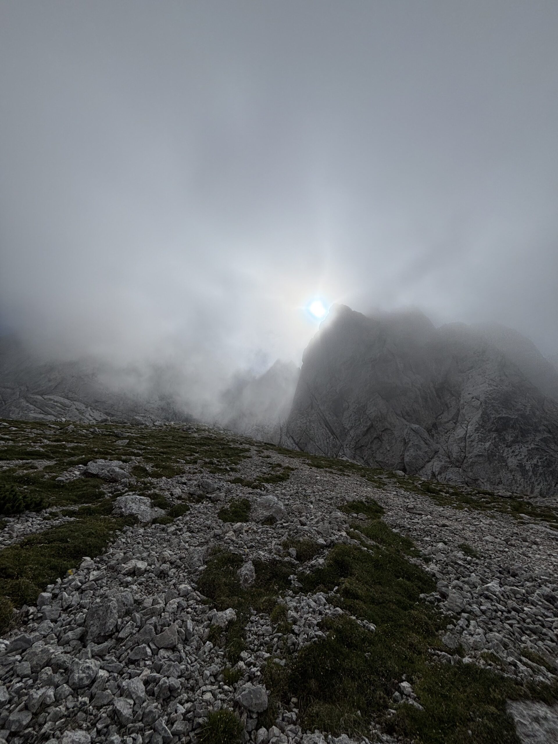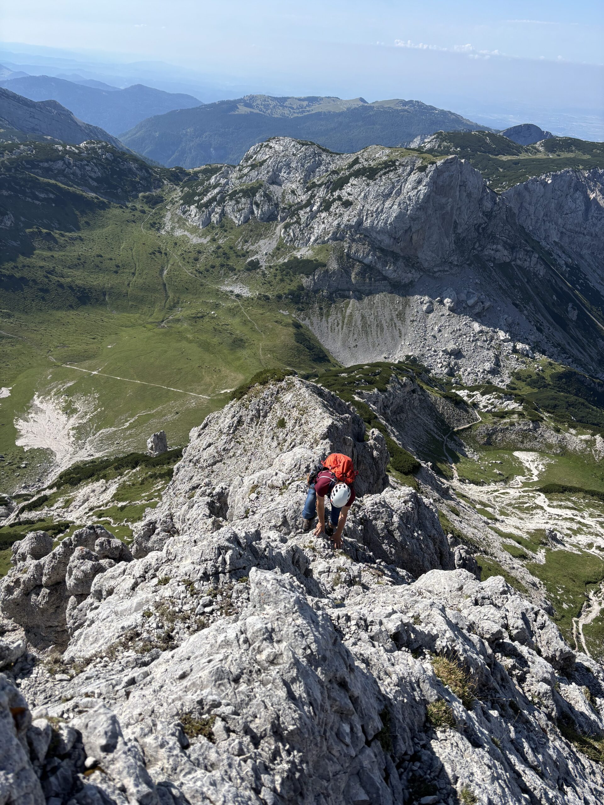 Jutro je bilo čudovito in res bi bilo škoda, da bi ga porabila samo za spust v dolino. Odločila sva se za južni greben Ojstrice – od Korošice po poti do značilne jame pod vrhom, potem pa desno v rušje in na greben. Tam se začne res lepo poplezavanje, orientacijsko brez težav, teren pa igriv. Meni osebno eden lepših načinov, kako priti na Ojstrico.