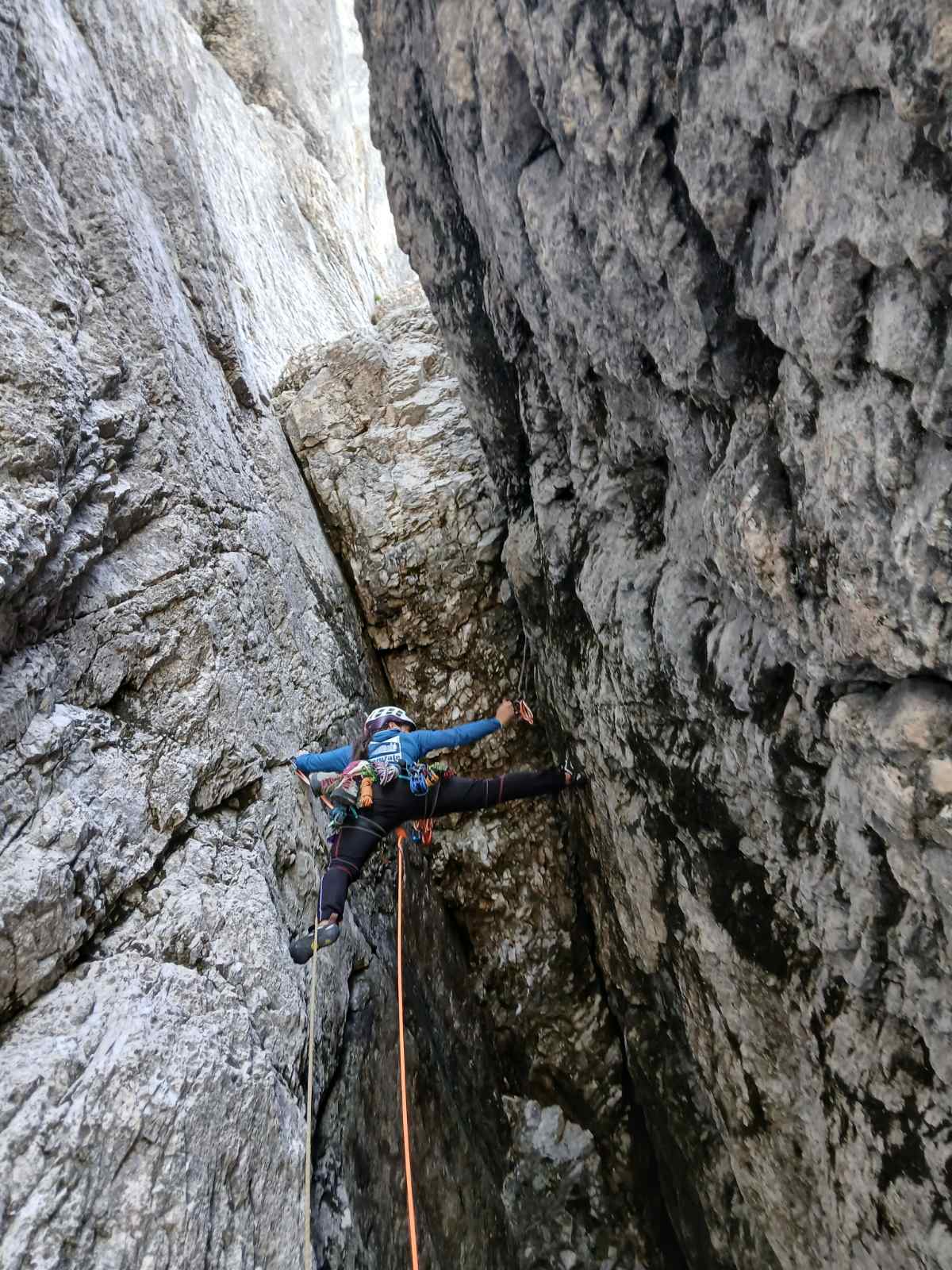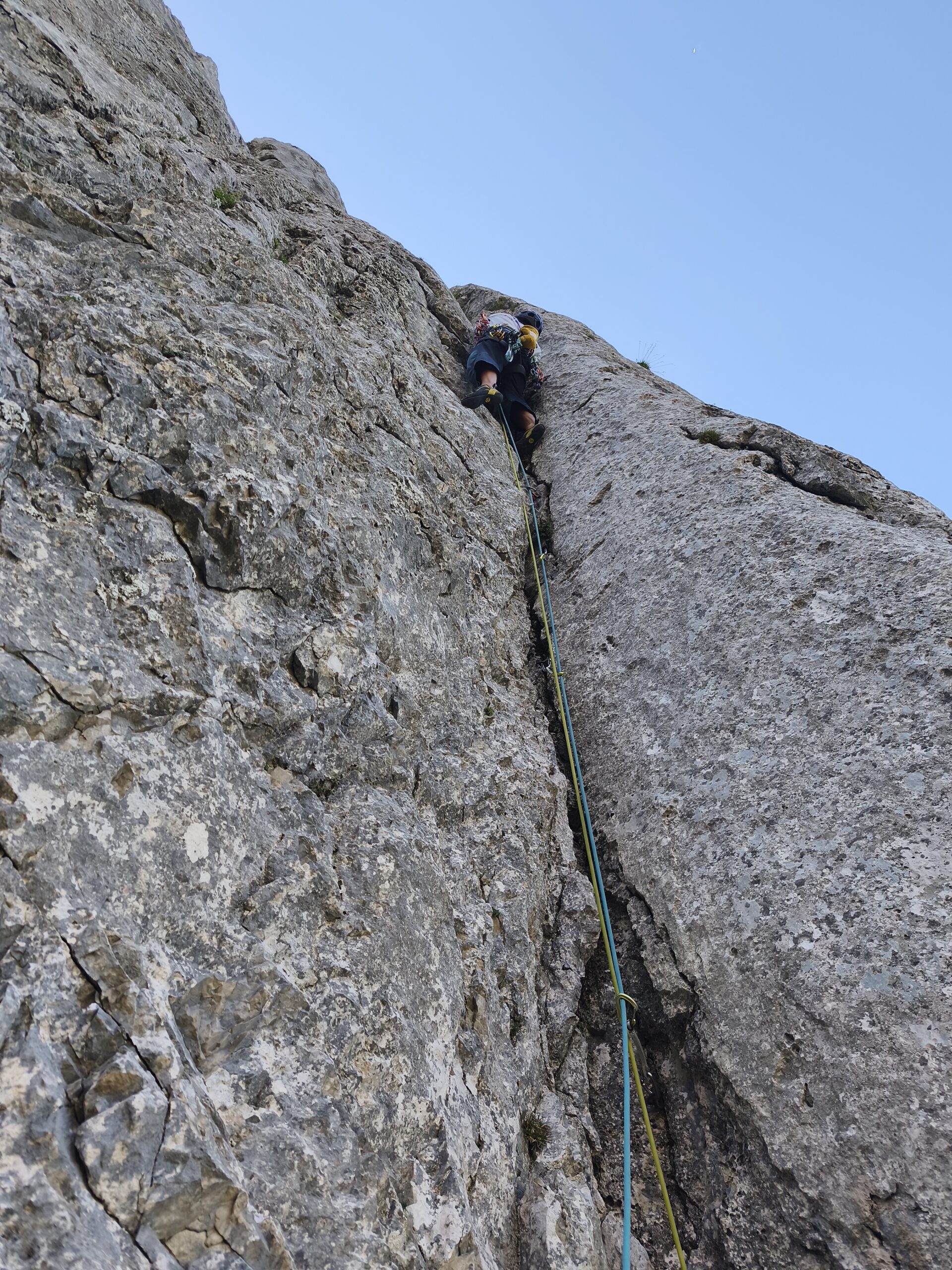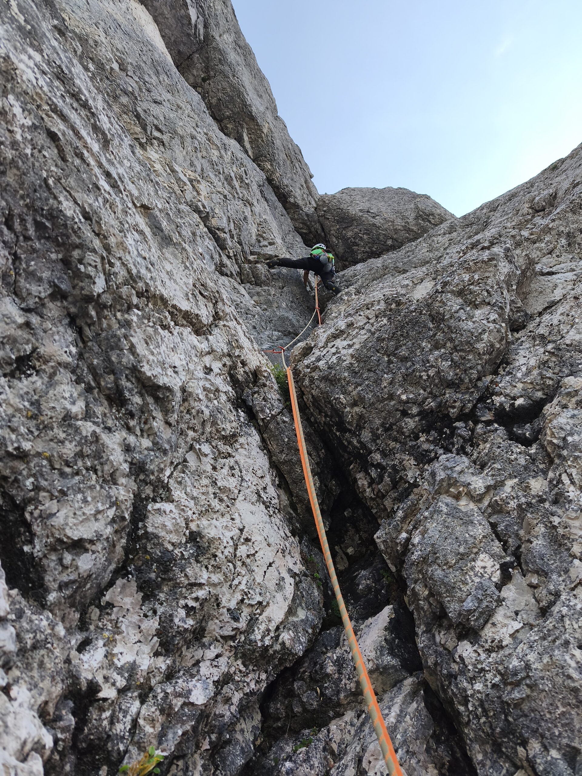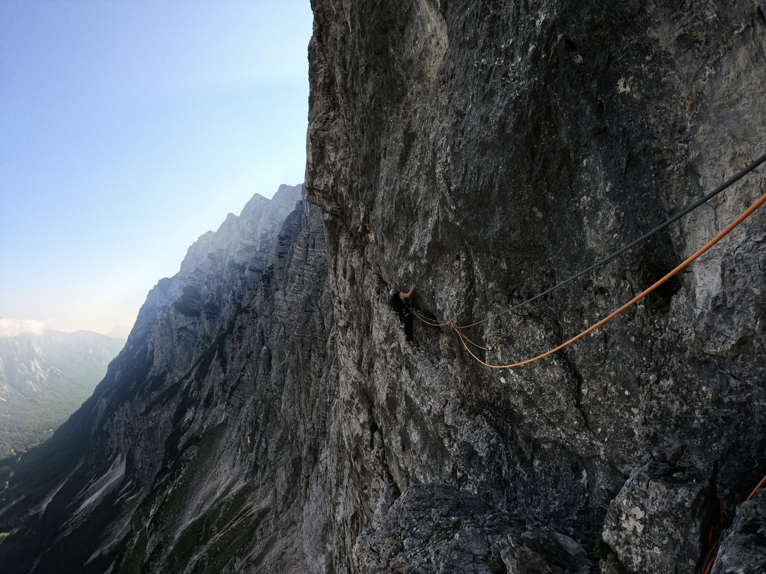 Smer nudi konstantno plezanje v večinoma dobri skali po zajedah in kaminih, za vmesno varovanje pa prav pride set frendov. Izstopila sva po direktni varianti, ki smeri doda še kakšen raztežaj več lepega plezanja. Po 11h v steni sledi še zoprn sestop do Trbiškega bivaka, od tam pa se spustiva po ferati Via della Vita. Vesela sem, da je domov vozil Vid, saj se mi po napornem dnevu v avtu takoj zaprejo oči.