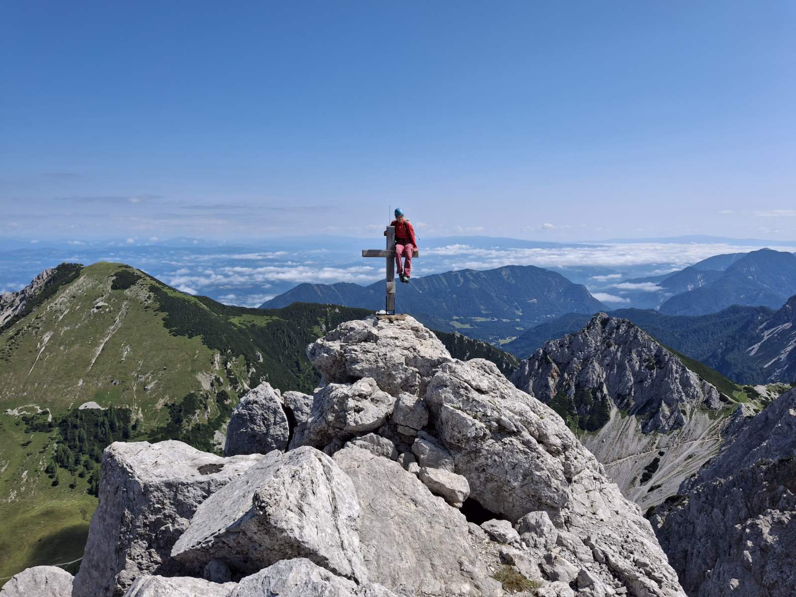 Za še eno hladno smer sva se šla predihat 19.7.2025 v smer Debelakove v Veliko Mojstrovko IV+/III 450m. Da nisva med zgodnjimi nama je povedal tako napis o zasedenosti parkirišča (letos še brezplačno) kot dejstvo, da sva bila četrta naveza v smeri… Šele sredi smeri sva ugotovila, da skice sploh ni bilo treba pogledati, saj sva le sledila štriku ali predhodnim navezam. Hvala dvema navezama iz AO Vipava in Žigi s tečajnikoma, da ste naju spustili naprej! Z Žigo smo se srečali po 25 letih sredi temačnega dela Mojstrovke (po Miheliču), a je bilo res premalo časa za klepet. Na pomolu s pogledom proti Jalovcu je že precej pihalo, nad nama so šibale meglice, ki so počasi zakrivale vrhove naokoli – kar pa ni zmanjšalo navdušenja nad res super dolomitsko skalo zadnjih nekaj raztežajev.