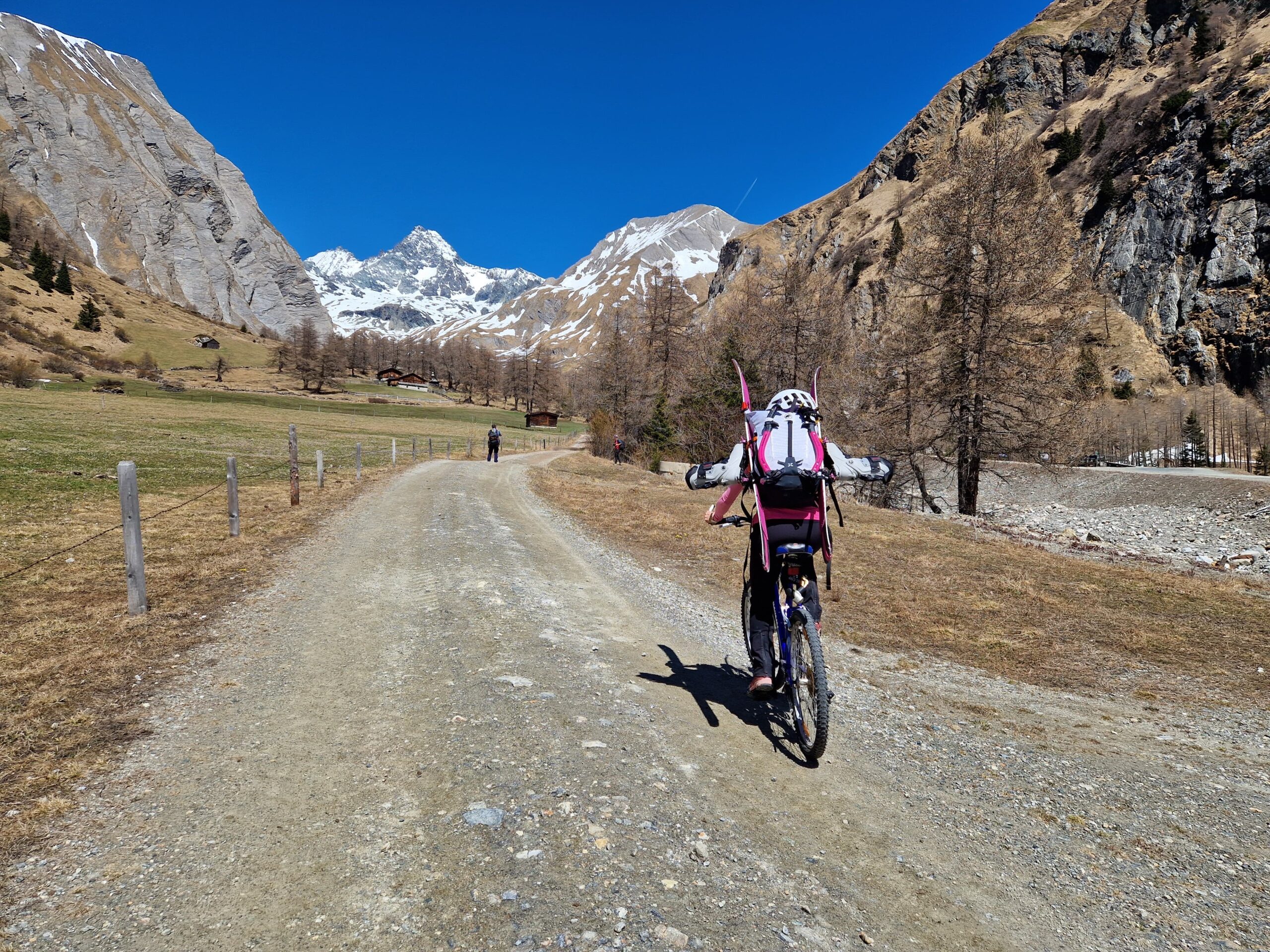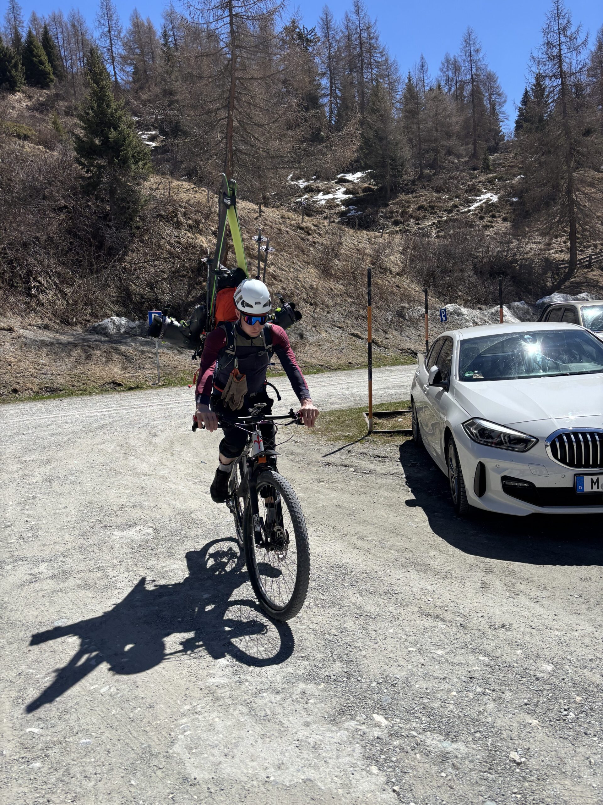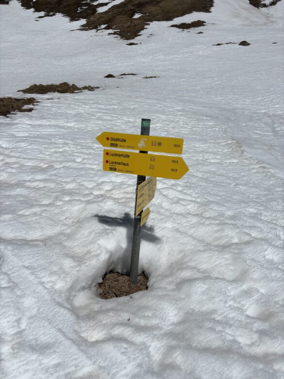 Smučke naloživa na hrbet, sedeva na kolesi in elegantno (kolikor je to z vso kramo sploh mogoče) odrineva proti prvi zaplati snega. Tam kolesi prikleneva kar na drevo in nadaljujeva peš do koče Lucknerhütte (2241 m), kjer končno obujeva smuči.