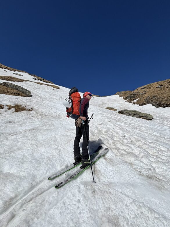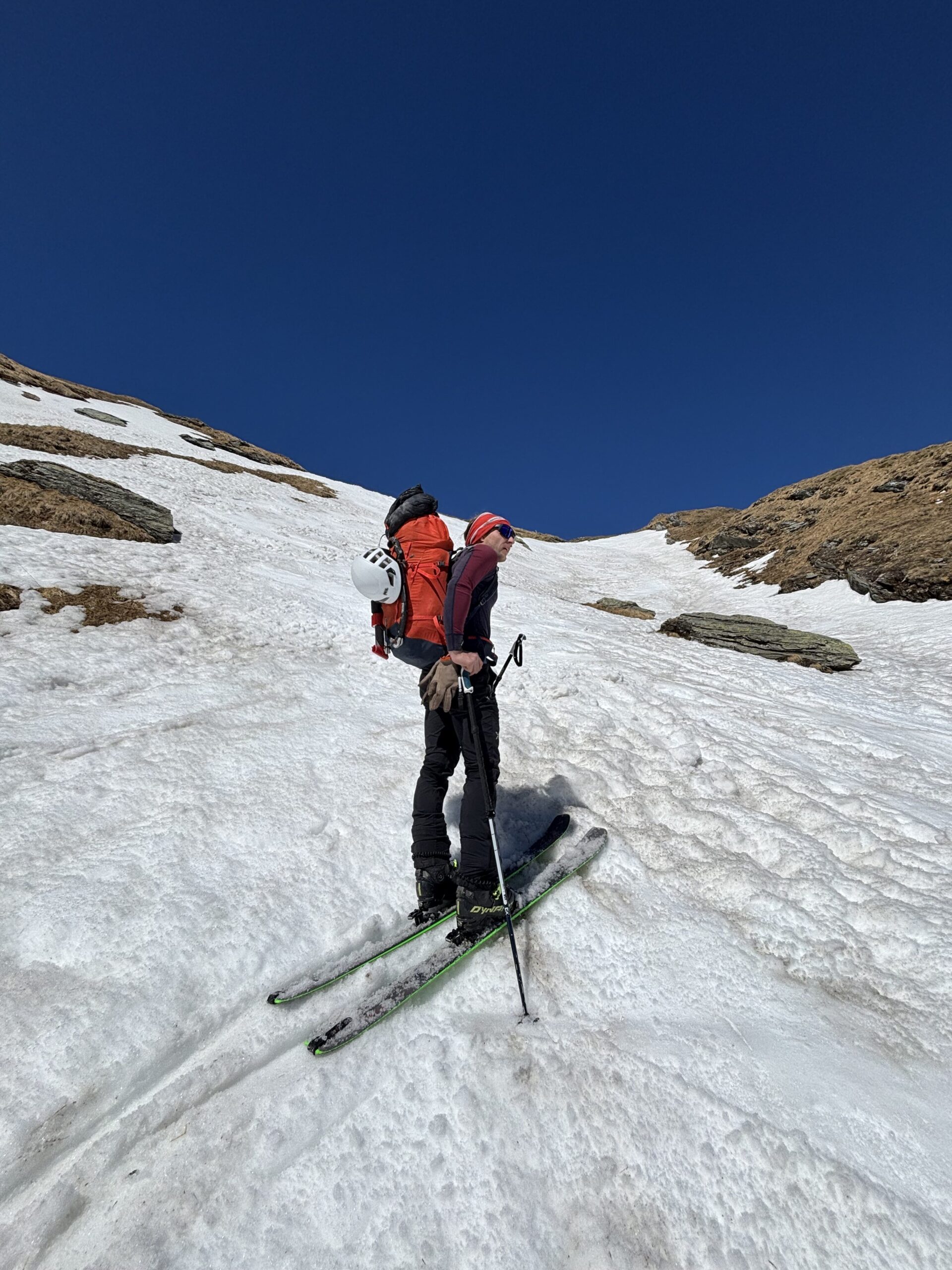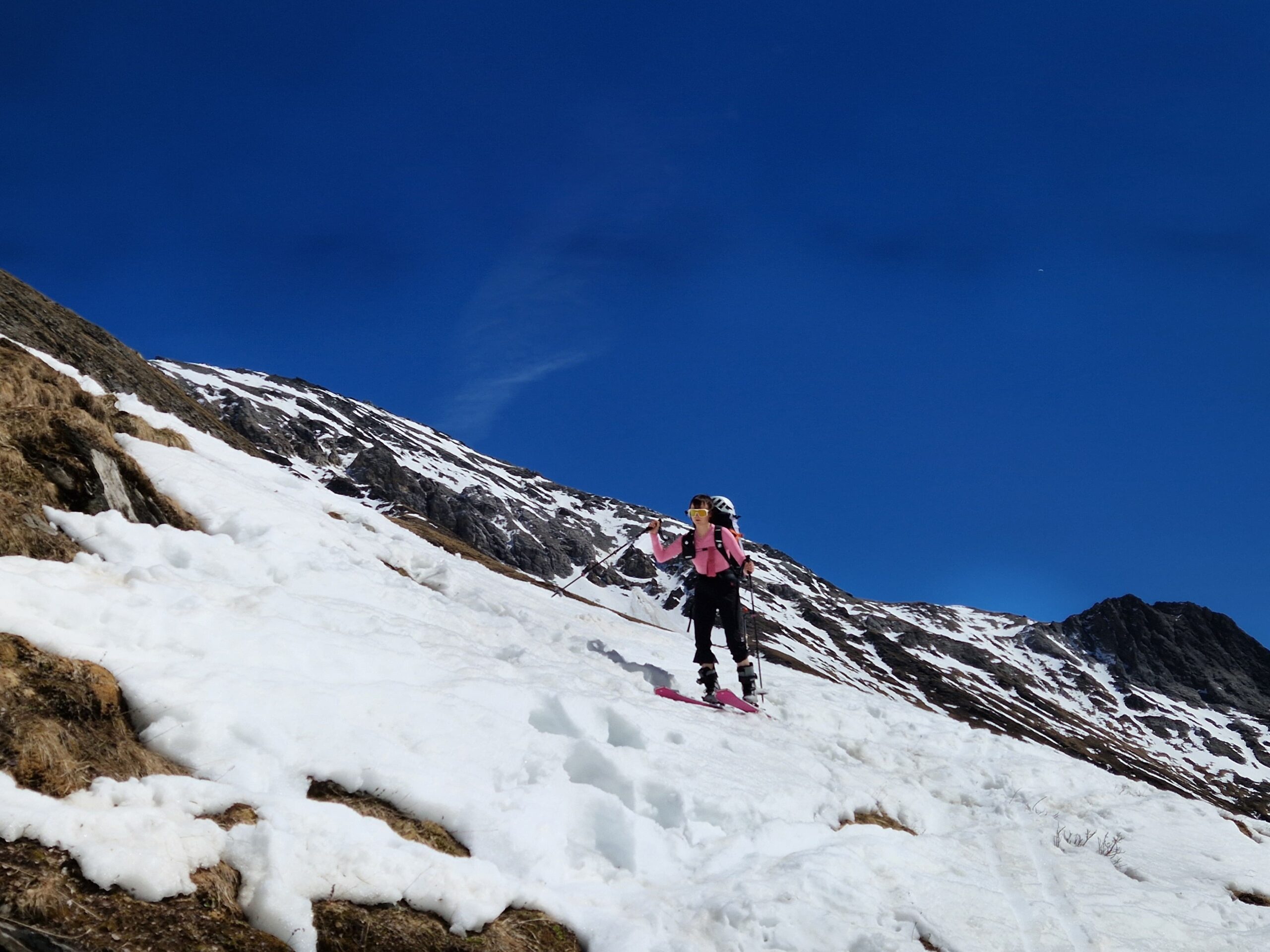 Ko prismuča do mene, nadaljujeva skupaj proti dolini. Iščeva zaplate snega in nižje ko sva, bolj redke so, dokler jih ni več. Smuči spet na hrbet in klasika pomladi v gorah.