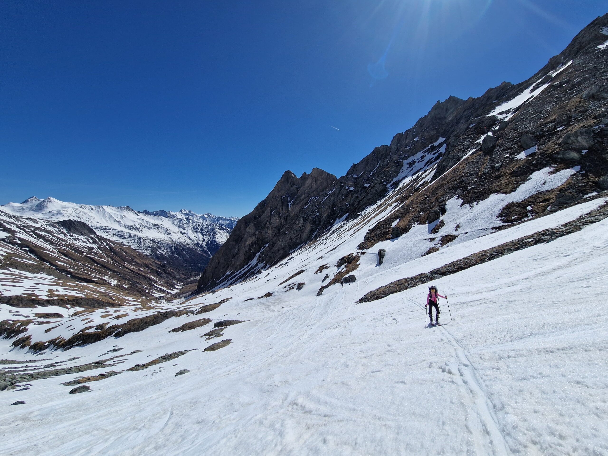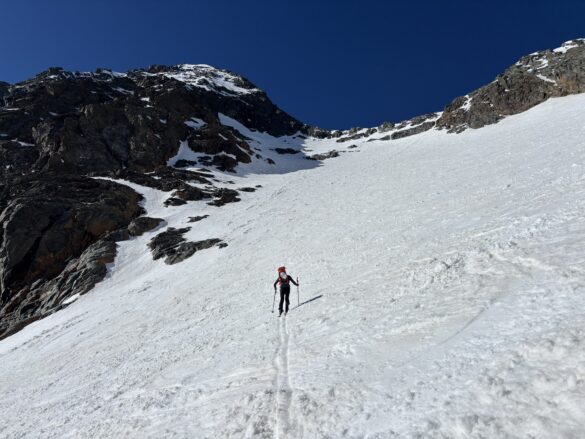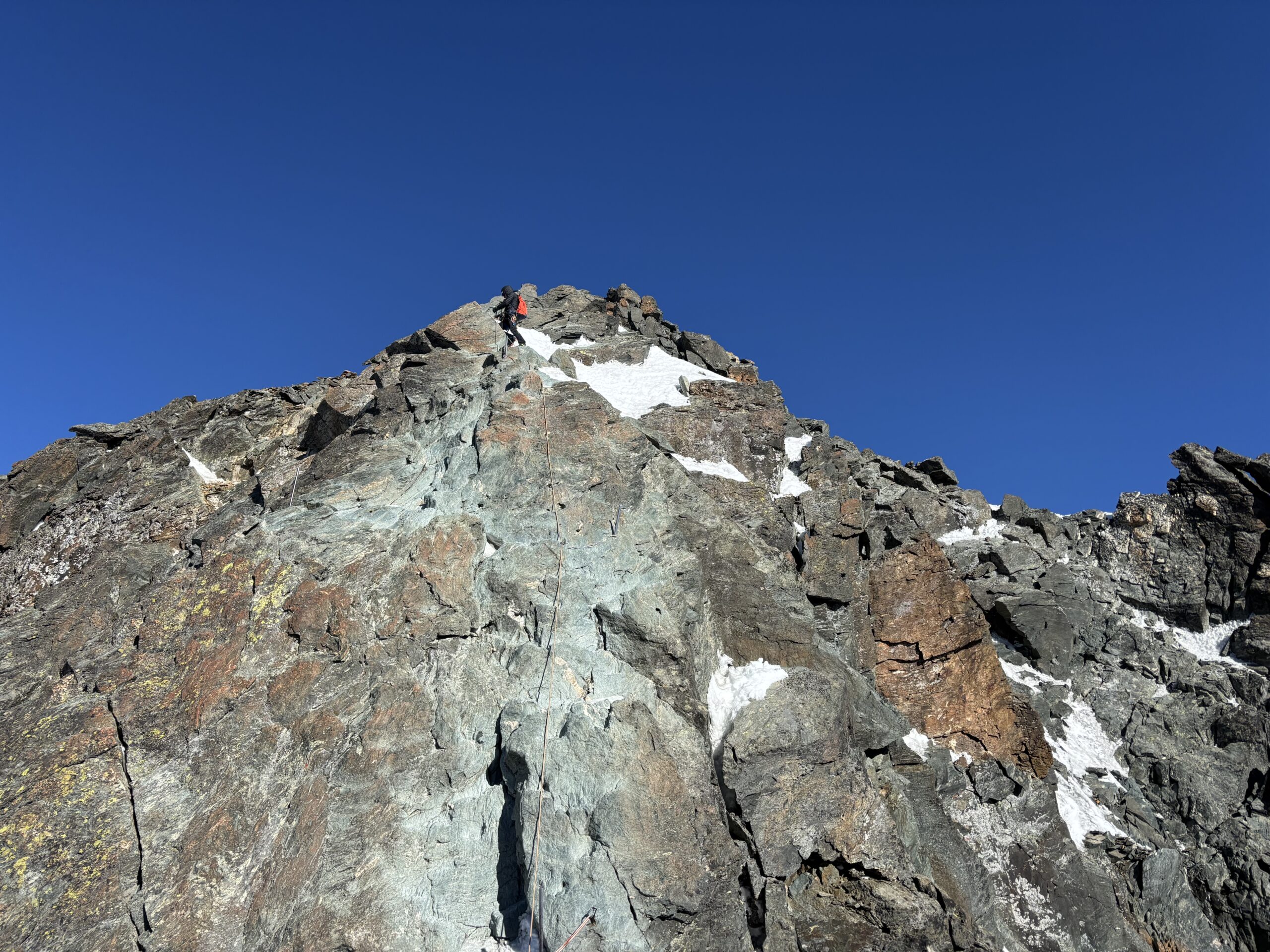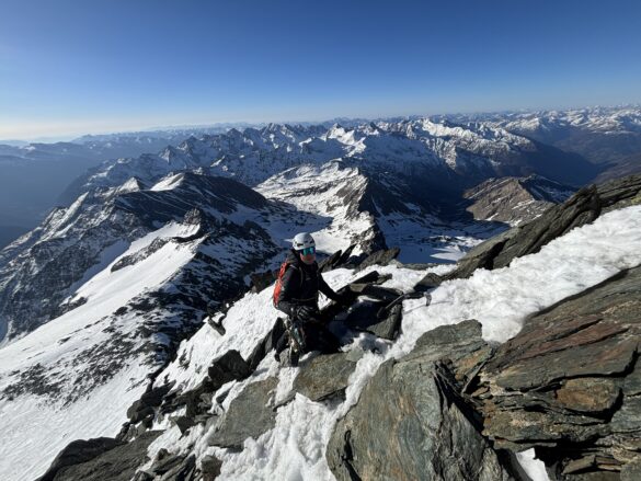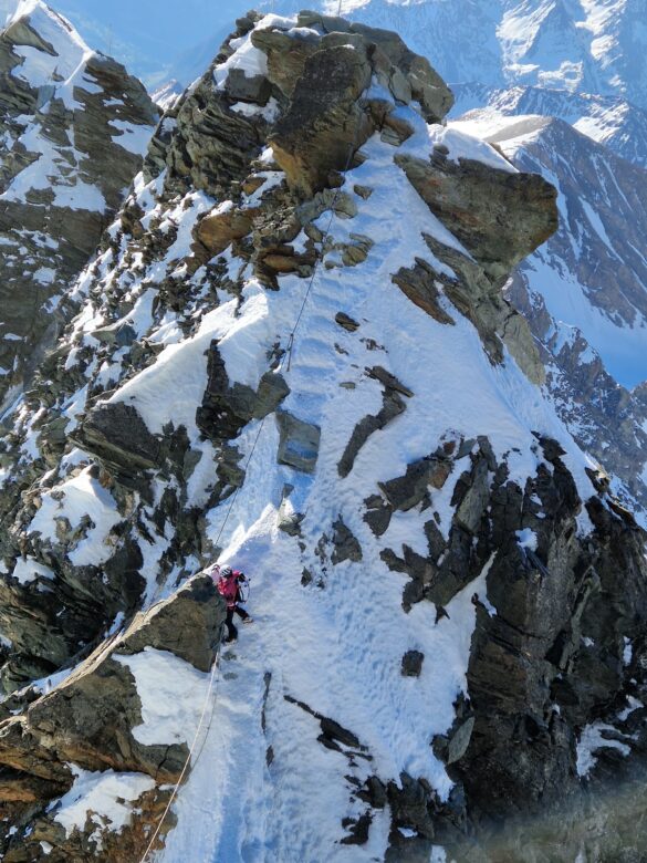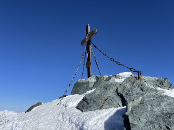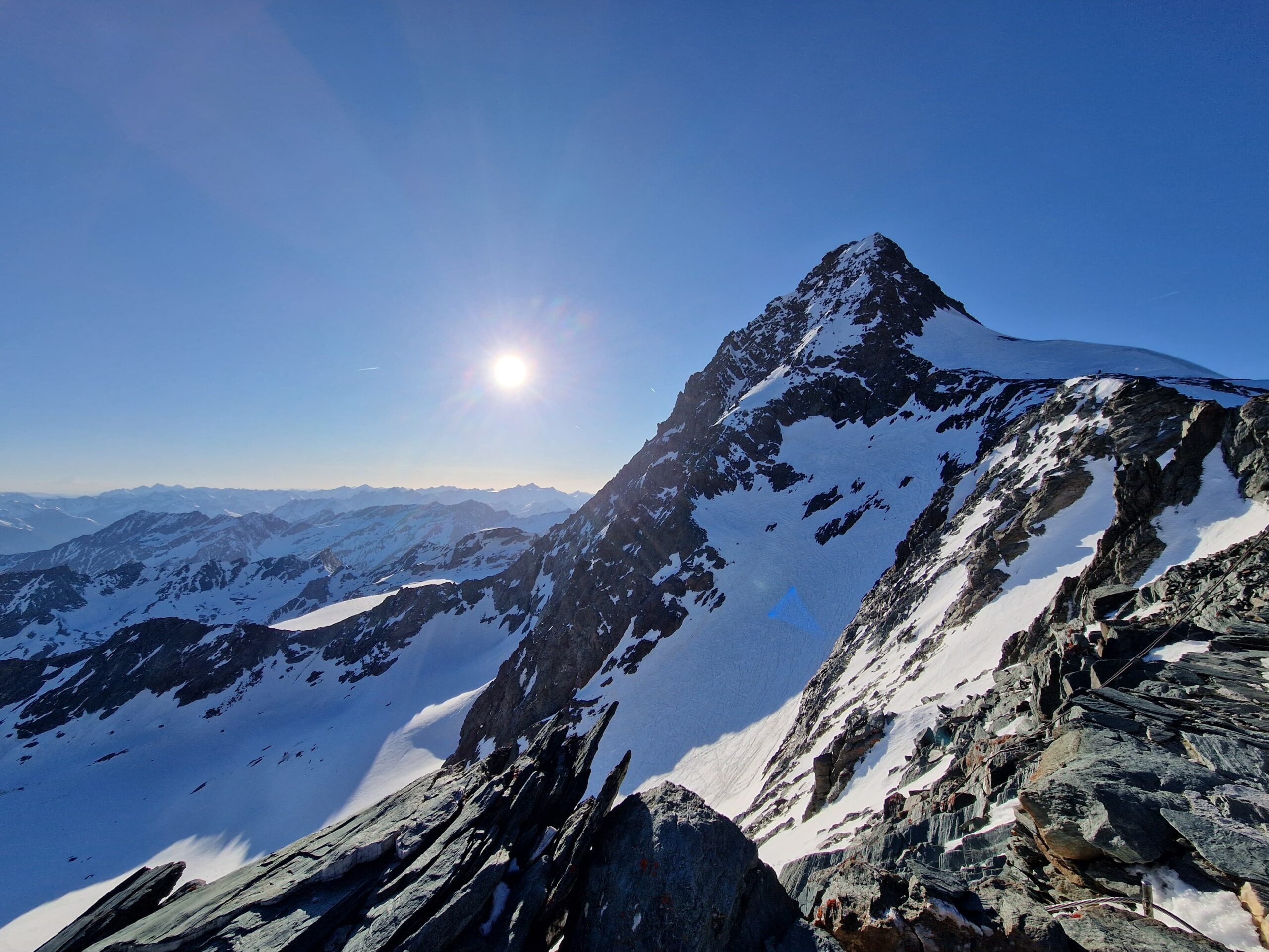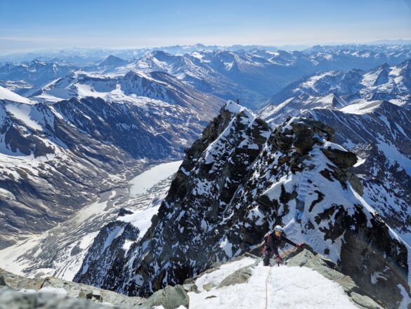 Ob 7h sva že na poti. Na greben vstopiva skozi grapo, cepini zagrizejo v sneg, in kmalu doseževa Kleinglockner. Sledi kratek, a izpostavljen sestop v škrbino, nato prečenje na skalno ploščo. Zaradi zgodnje ure sva skoraj sama, le dve navezi pred nama, ki ju ujameva tik pod vrhom.