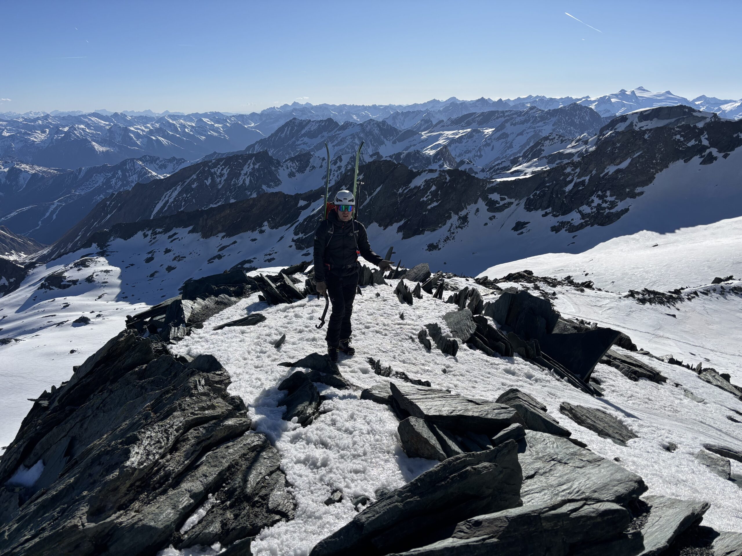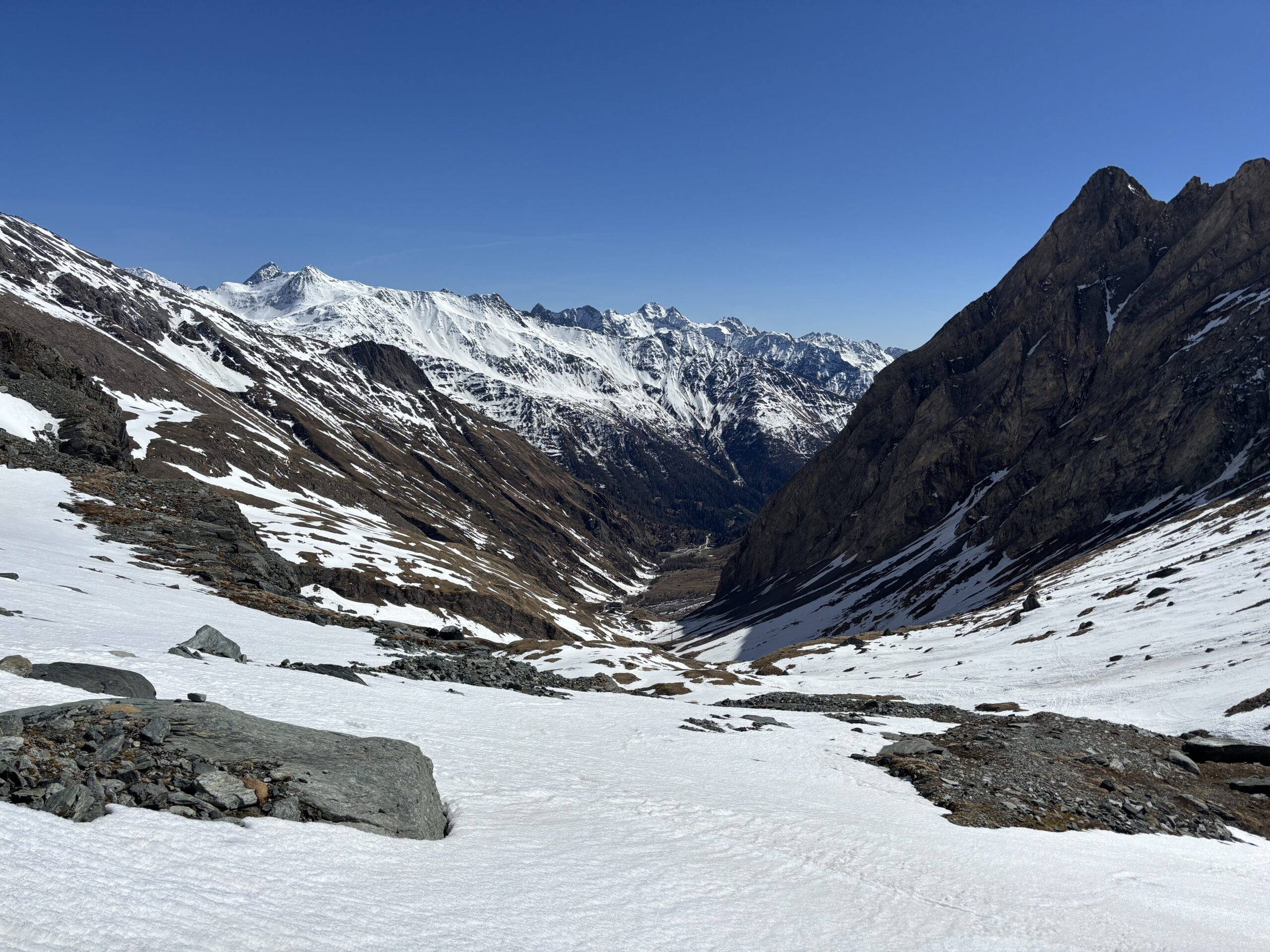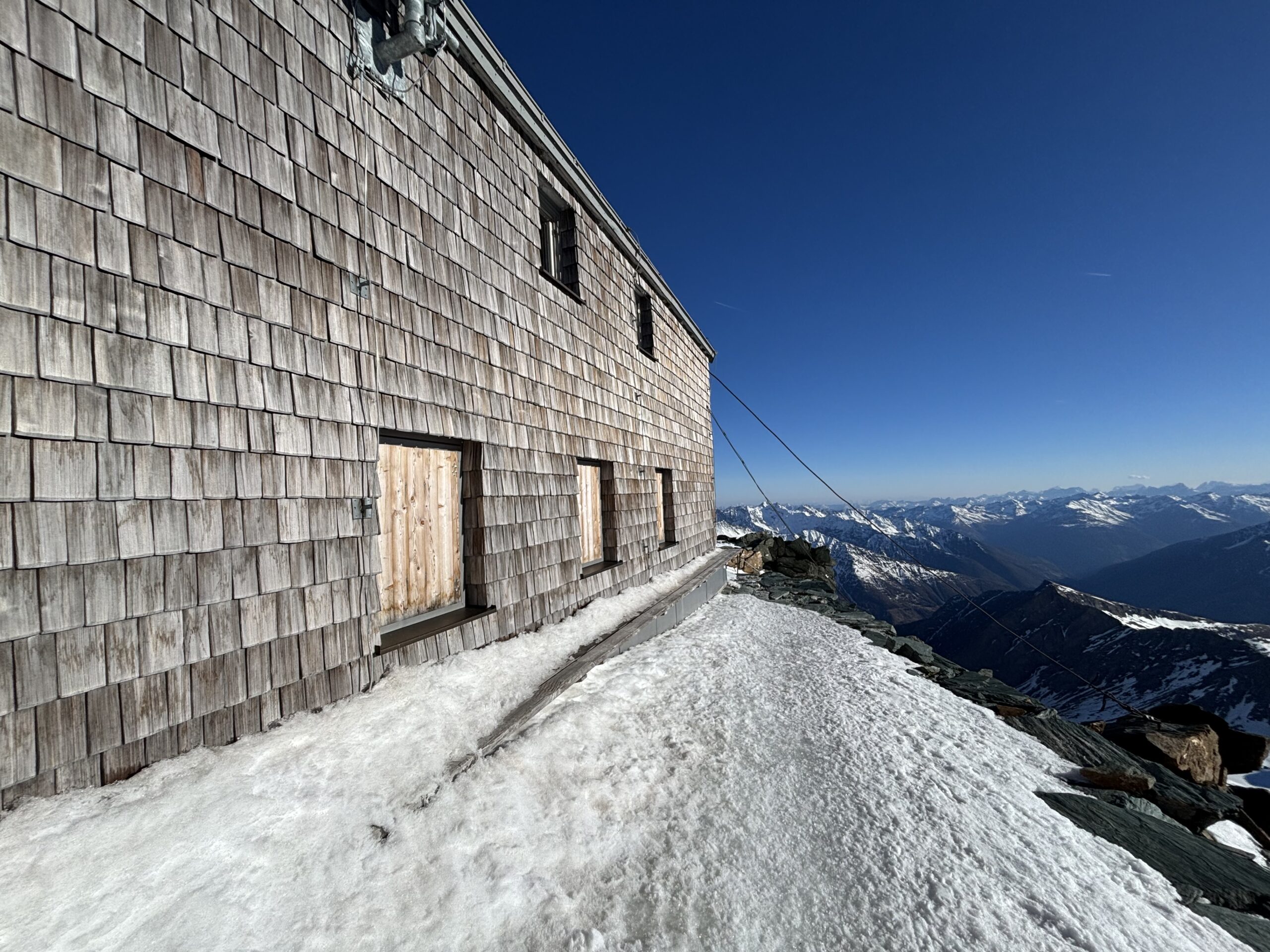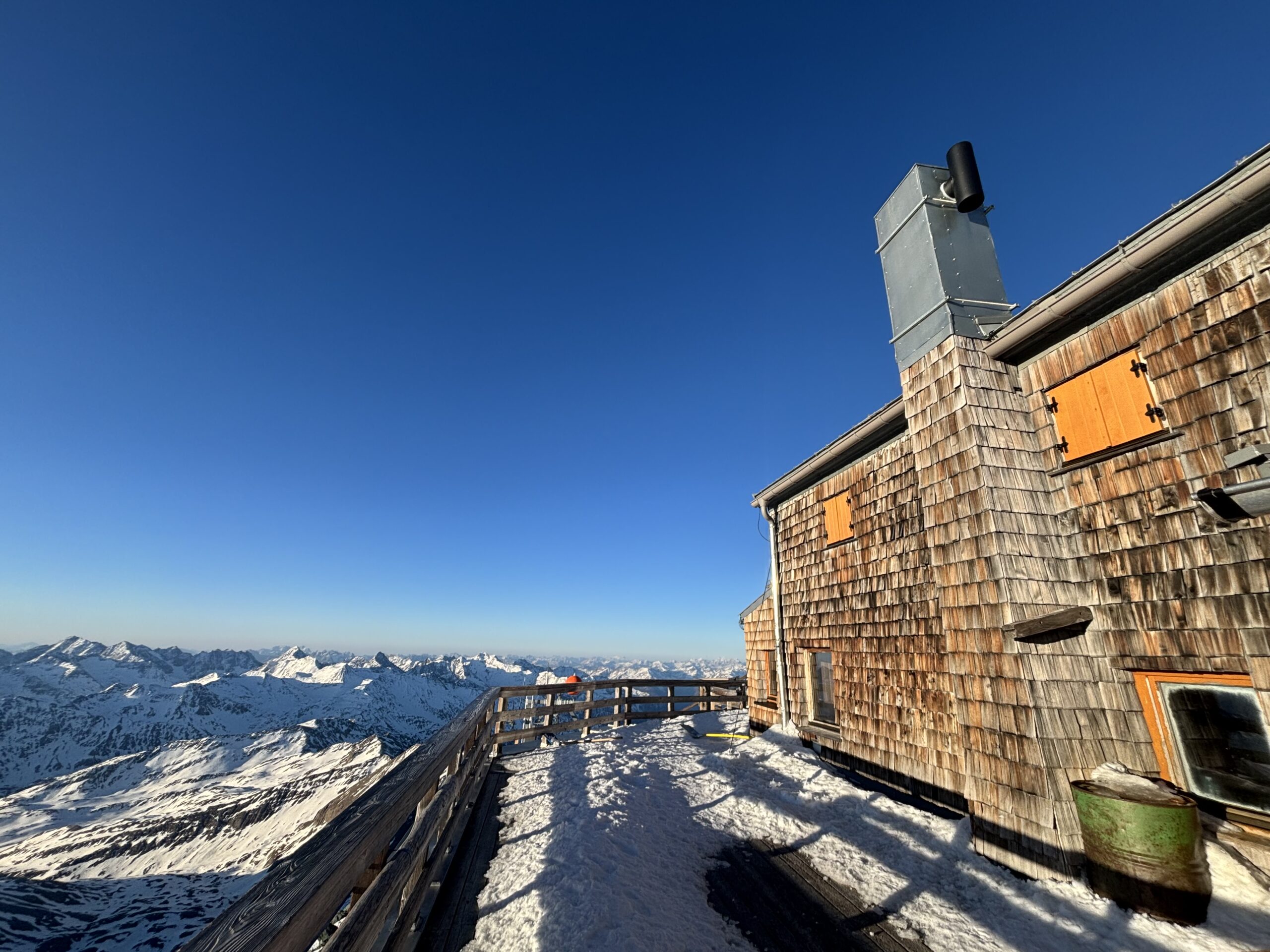 Ob 7h sva že na poti. Na greben vstopiva skozi grapo, cepini zagrizejo v sneg, in kmalu doseževa Kleinglockner. Sledi kratek, a izpostavljen sestop v škrbino, nato prečenje na skalno ploščo. Zaradi zgodnje ure sva skoraj sama, le dve navezi pred nama, ki ju ujameva tik pod vrhom.