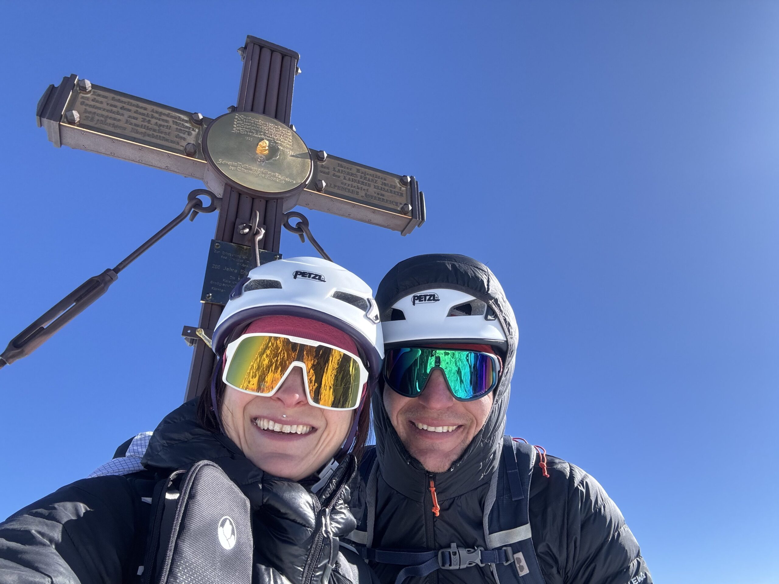 Zadnji metri do križa so skoraj igrivi. Sonce naju boža, veter preizkuša. Vzpon je bil prava mešanica vsega: skale, sneg, cepini, roke. Alpski “mix”, ki te drži budnega od začetka do konca.